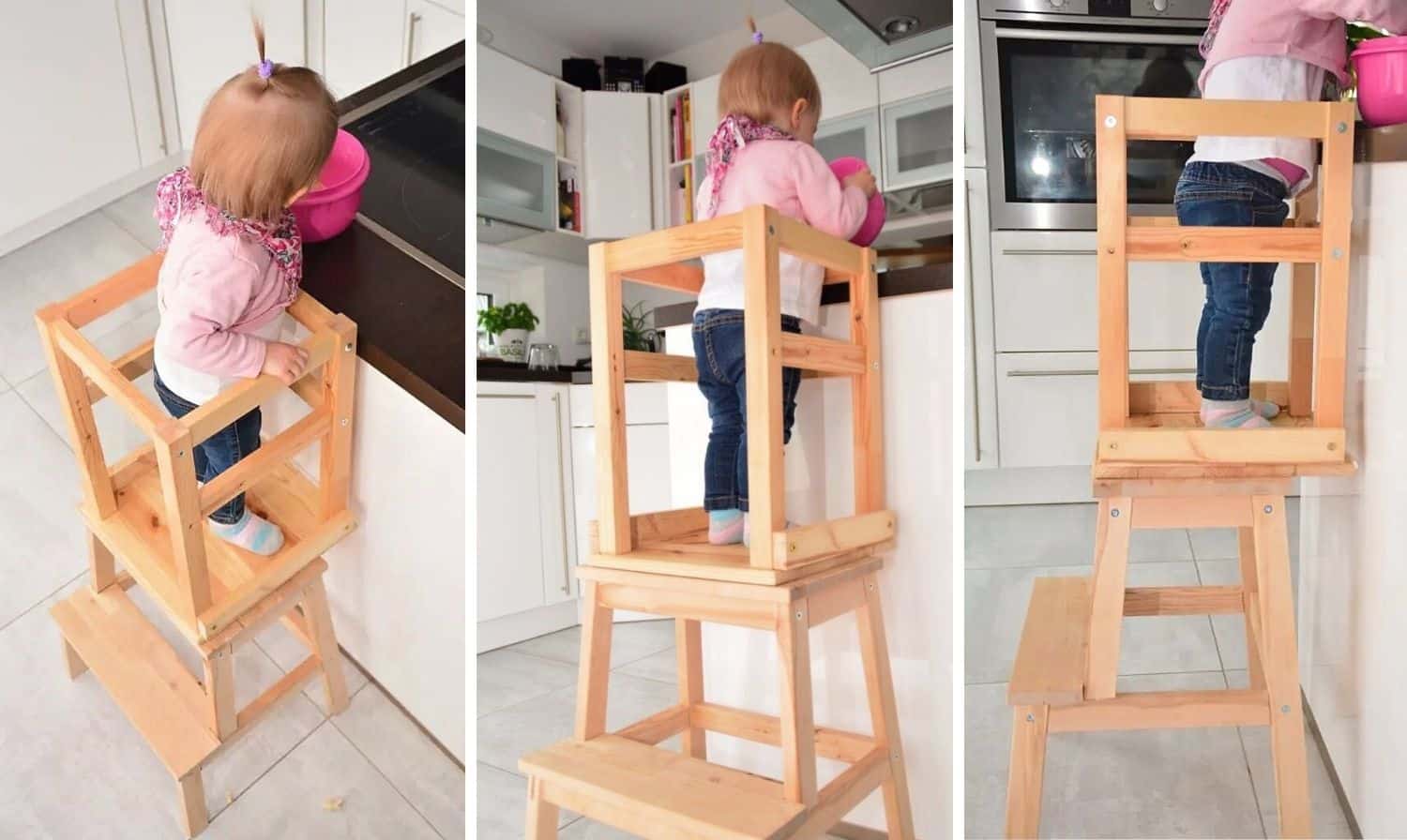 La tour Montessori ne se limite pas à l’autonomie. Elle stimule la motricité, la coordination, l’équilibre. Pour les parents, c’est aussi l’assurance d’avoir les mains libres tout en sachant leur enfant en sécurité, bien calé sur sa plateforme, prêt à participer aux activités du quotidien.